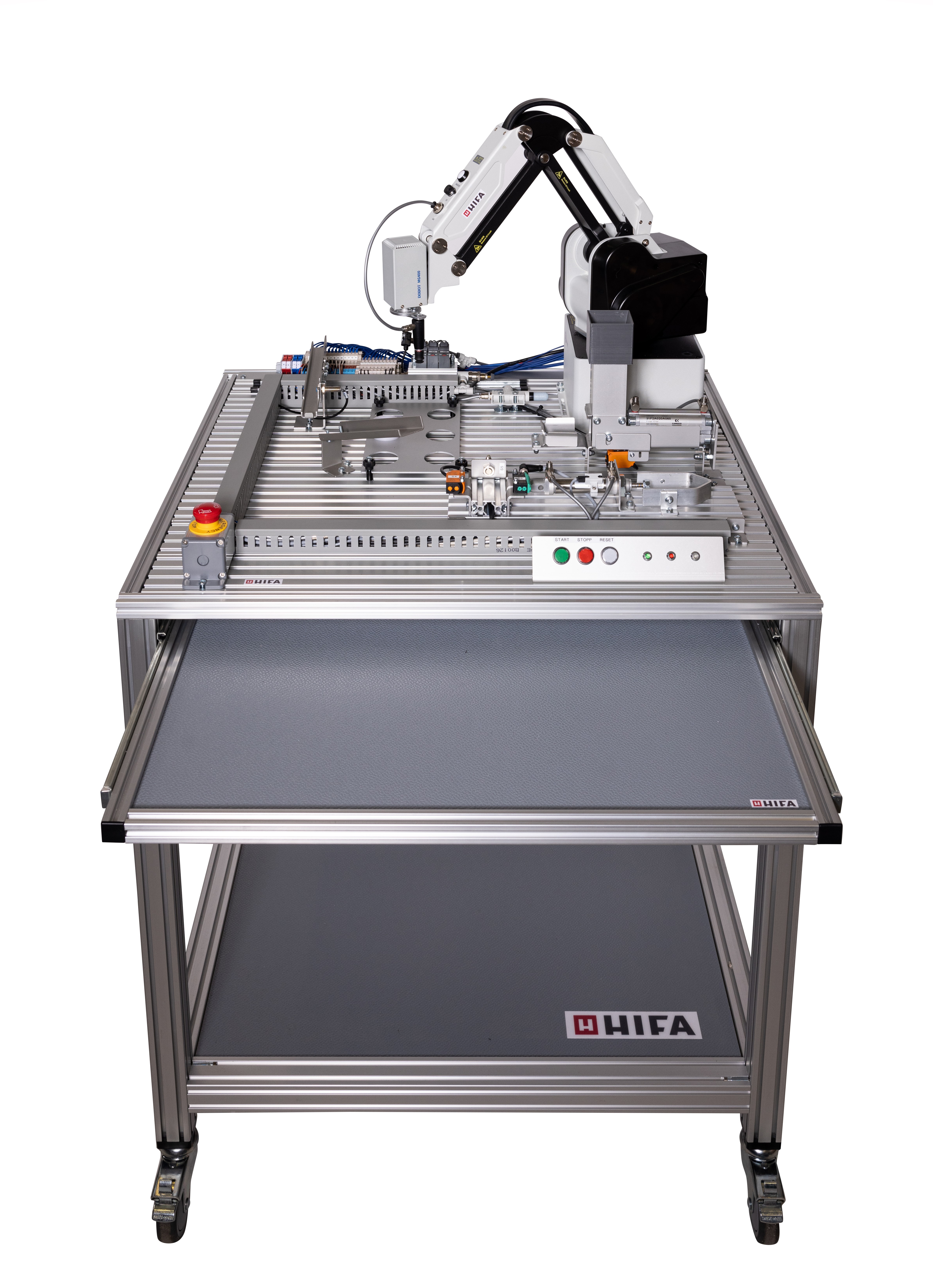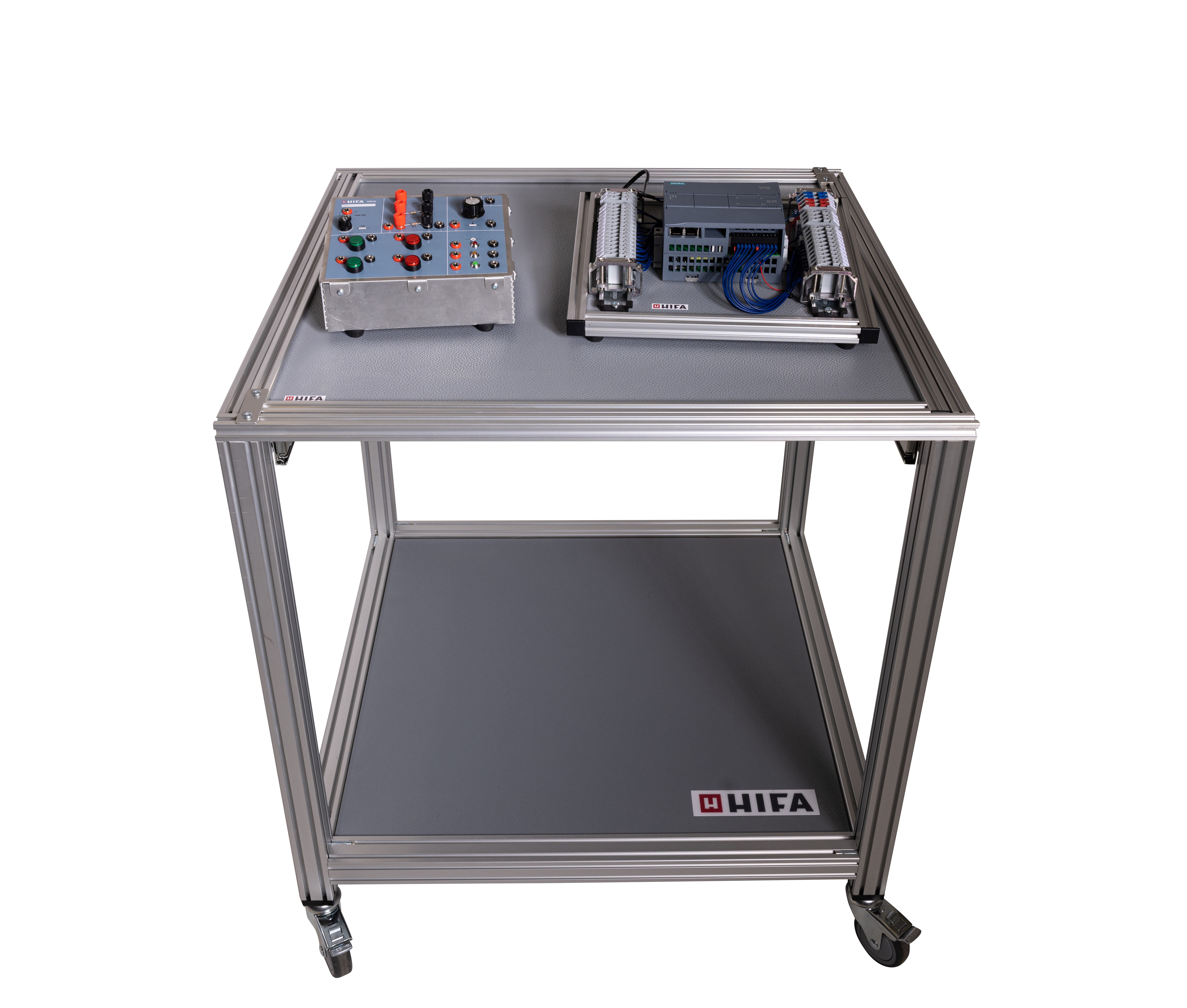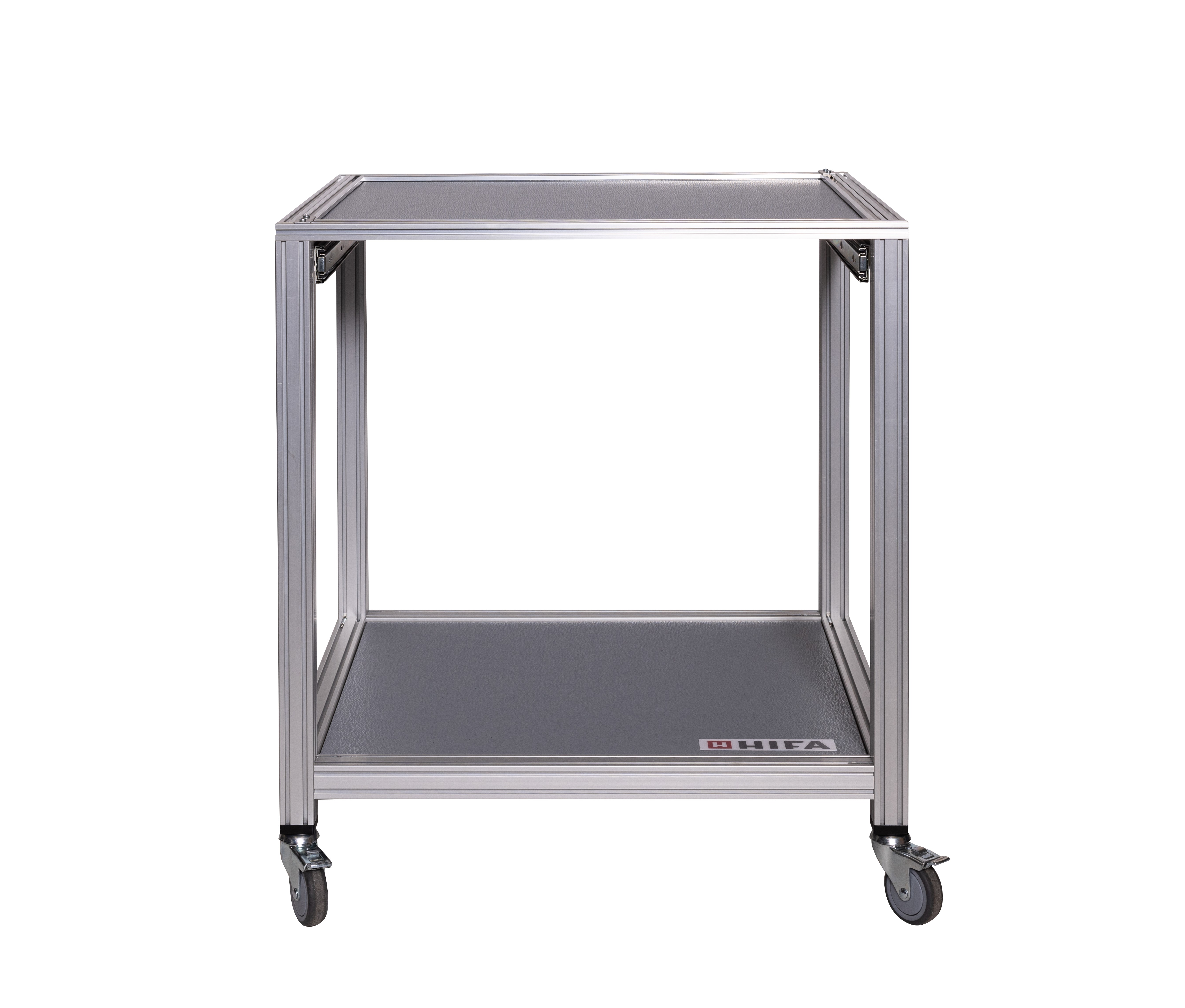 Trolley for our Training kits in aluminum profile system. Possibility to store the case underneath the base plate.